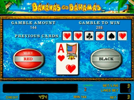 Рискованный раунд игрового автомата «Бананы едут на Багамы» позволяет игроку увеличить размер денежной прибыли в 2 раза. Суть рискованной игры состоит в том, что клиенту следует угадать масть предложенной карты. Если выбор окажется верным, то выигрышная сумма от удачного спина увеличивается вдвое. Игра ва-банк проходит в 5 этапов. Это значит, что игрок может увеличивать заработанную сумму до 5 раз. В любой момент клиент может остановить рискованный раунд. Заработанные средства автоматически начисляются на игровой баланс пользователя казино.