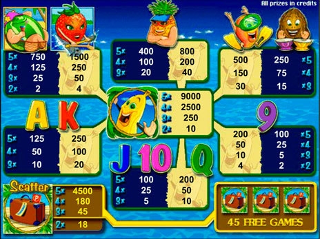 Интерфейс игрового аппарата выполнен в виде пляжного берега океана. На берегу расположены пляжные бары. Из заведений открывается завораживающий пейзаж океана. На пяти игровых барабанах то и дело появляются всевозможные виды фруктов. Клубника, банан, арбуз, ананас, кокос и др. выступают главными атрибутами игрового автомата.