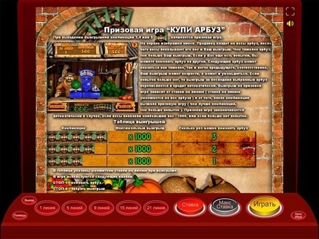 Первый тематический призовой раунд запускается арбузом, который продает жадный грузин. Бонусная игра «Приобрести арбуза» приносит покупателю гарантированный приз. Выигрыш напрямую зависит от числа арбузов, попавшихся игроку. Пользователь может использовать до 3 изменений разнотипных символов арбузом. Бонусный раунд заканчивается после того, как последующую выплату увеличить не получится. Тогда игрок остается без ранее заработанного приза.