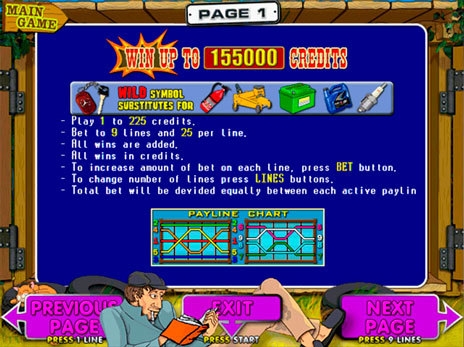 В видео слоте насчитывается до 25 игровых линий. Минимальная ставка на одну полосу колеблется от 1 до 25 центов. Наивысшая ставка игрового автомата Гараж достигает 225 американских долларов.