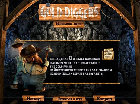 В видео слоте Gold Diggers при появлении на экране 3 или больше листовки Gold Rush запускается бонусный раунд. В мгновении ока с экрана исчезают барабаны, а три персонажа (золотоискатель, помощник и блондинка) выбегают к стене, по которой предлагается ударить в одно из возможных мест киркой и найти спрятанное золото.