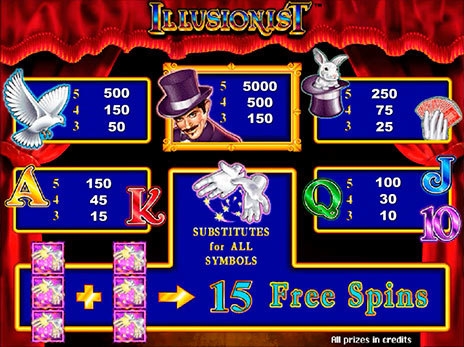 Призовых бонусных раундов тематического характера в видео слоте Illusionist не предусмотрено. Бонусная политика ограничивается раундом бесплатных вращений.